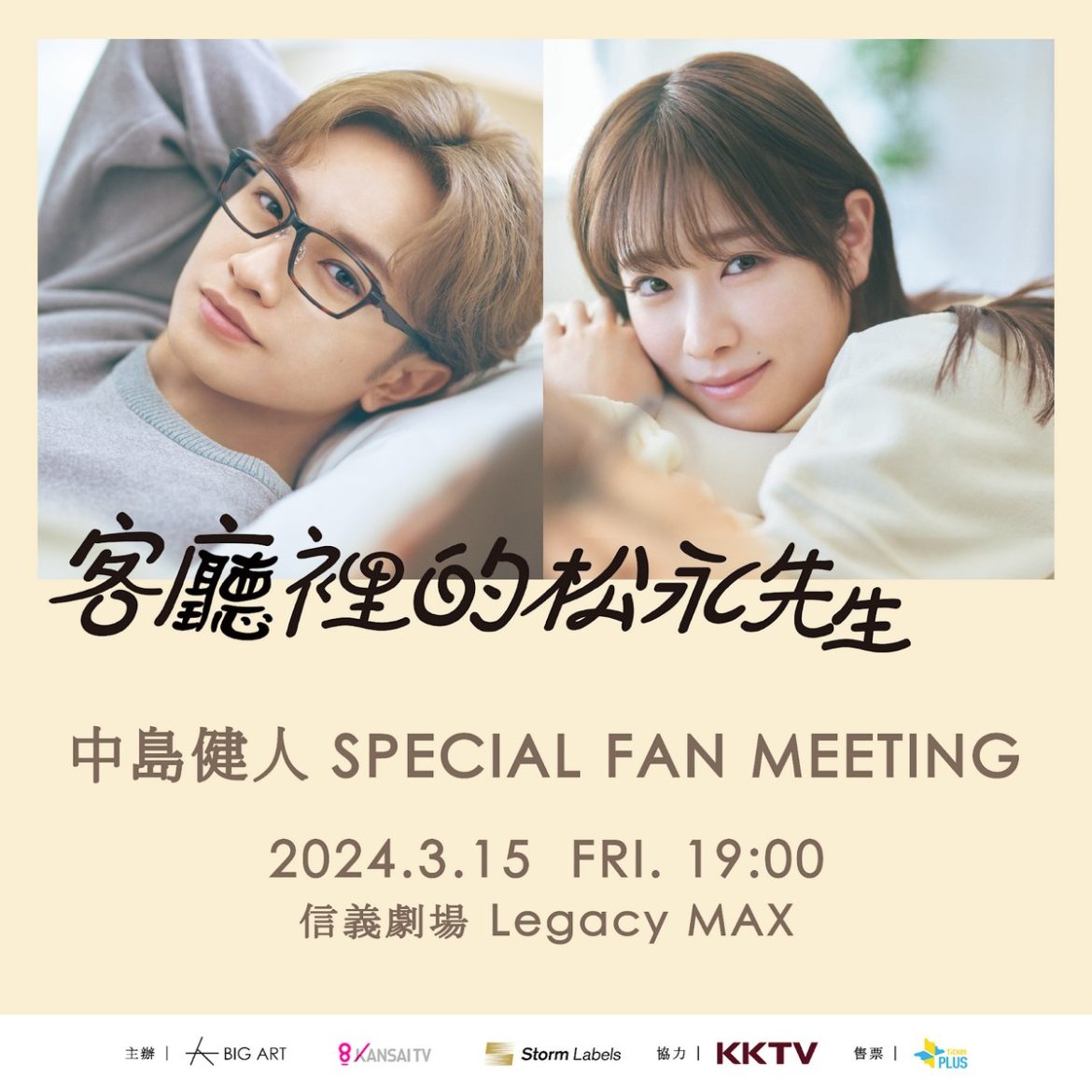 這次《客廳裡的松永先生》舉辦主題海外見面會的地點首選就是台北,同時這也是中島健人首次以戲劇主演身份在海外舉辦個人見面會!在『「客廳裡的松永先生」中島健人SPECIAL FAN MEETING』中,與中島健人一同欣賞、回顧劇中精彩片段,除了可以一探松永純的使用說明書,也能在現場捕捉到更多Kenty瀟灑帥氣、性感又可愛的一面。